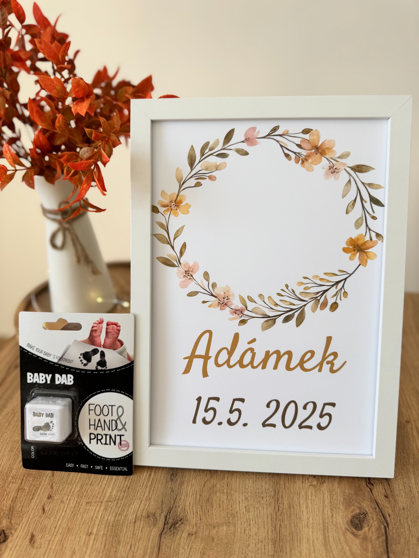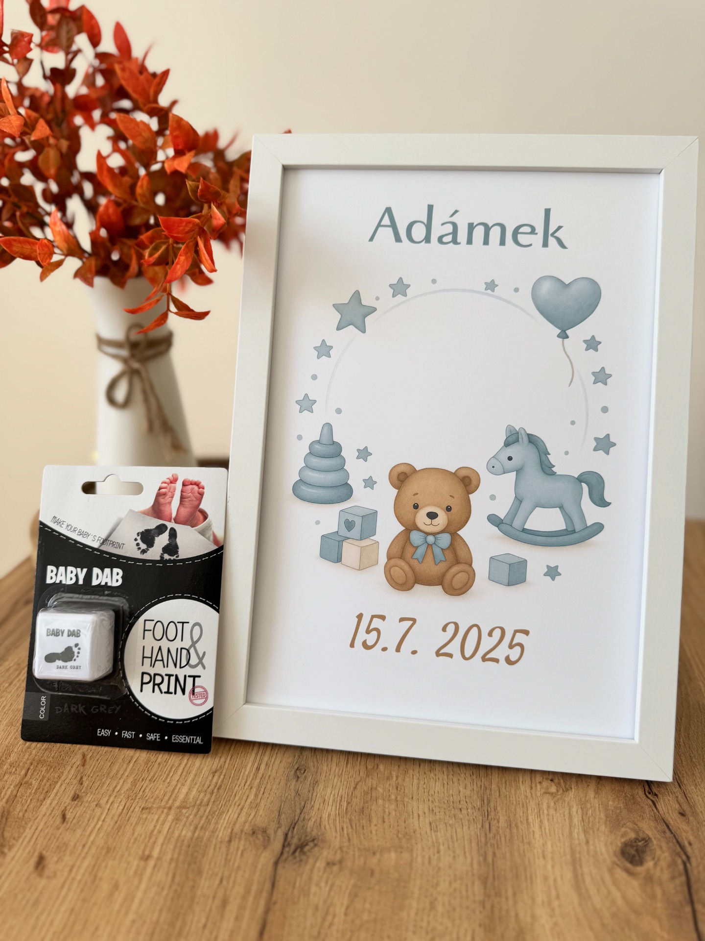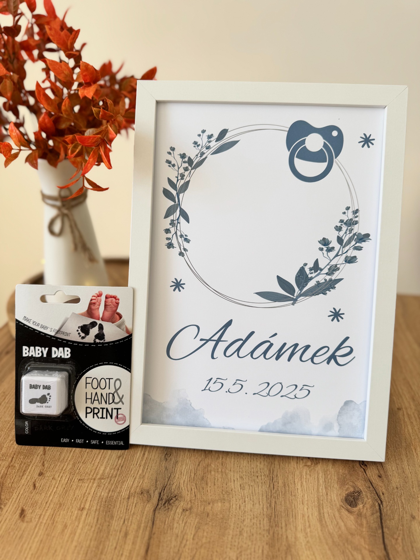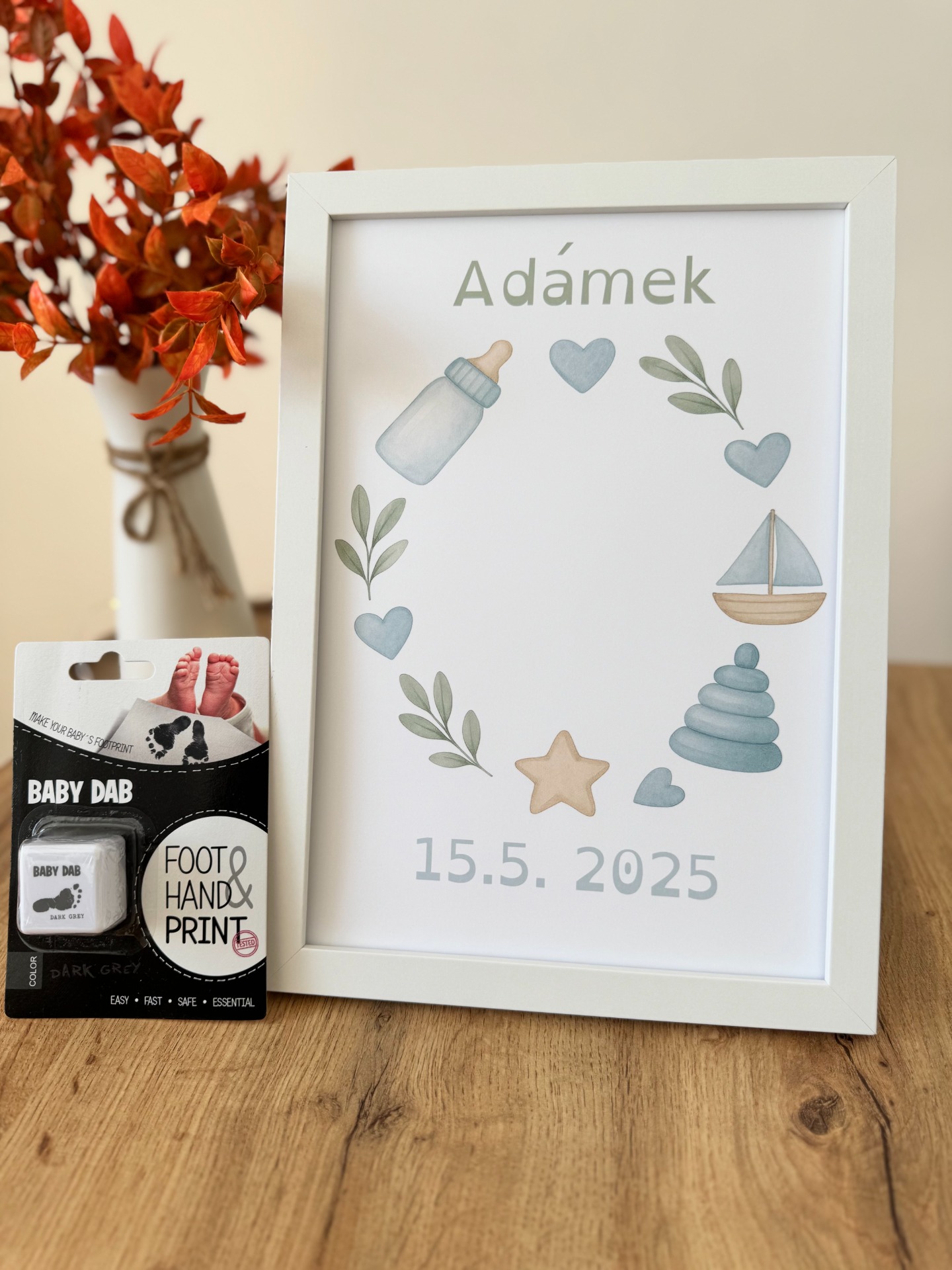 Obrázek je vytištěn na kvalitní matný papír 230g/m2, vhodný pro práci s inkoustem. V sadě naleznete 2x výtisk (kdyby se na poprvé nepodařilo) a také bezpečnou netoxickou barvu Baby dab, vhodnou pro novorozence. Lze zadat jen křestní jméno (“Adámek”, “Terezka”) a datum narození. Ve formátu A4 doporučujeme udělat jeden otisk ručičky nebo nožičky do volného prostoru, pokud si vyberete formát A3, krásně se vám vejdou obě ručičky/nožičky vedle sebe.