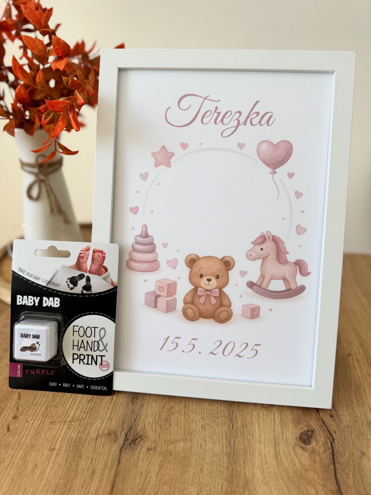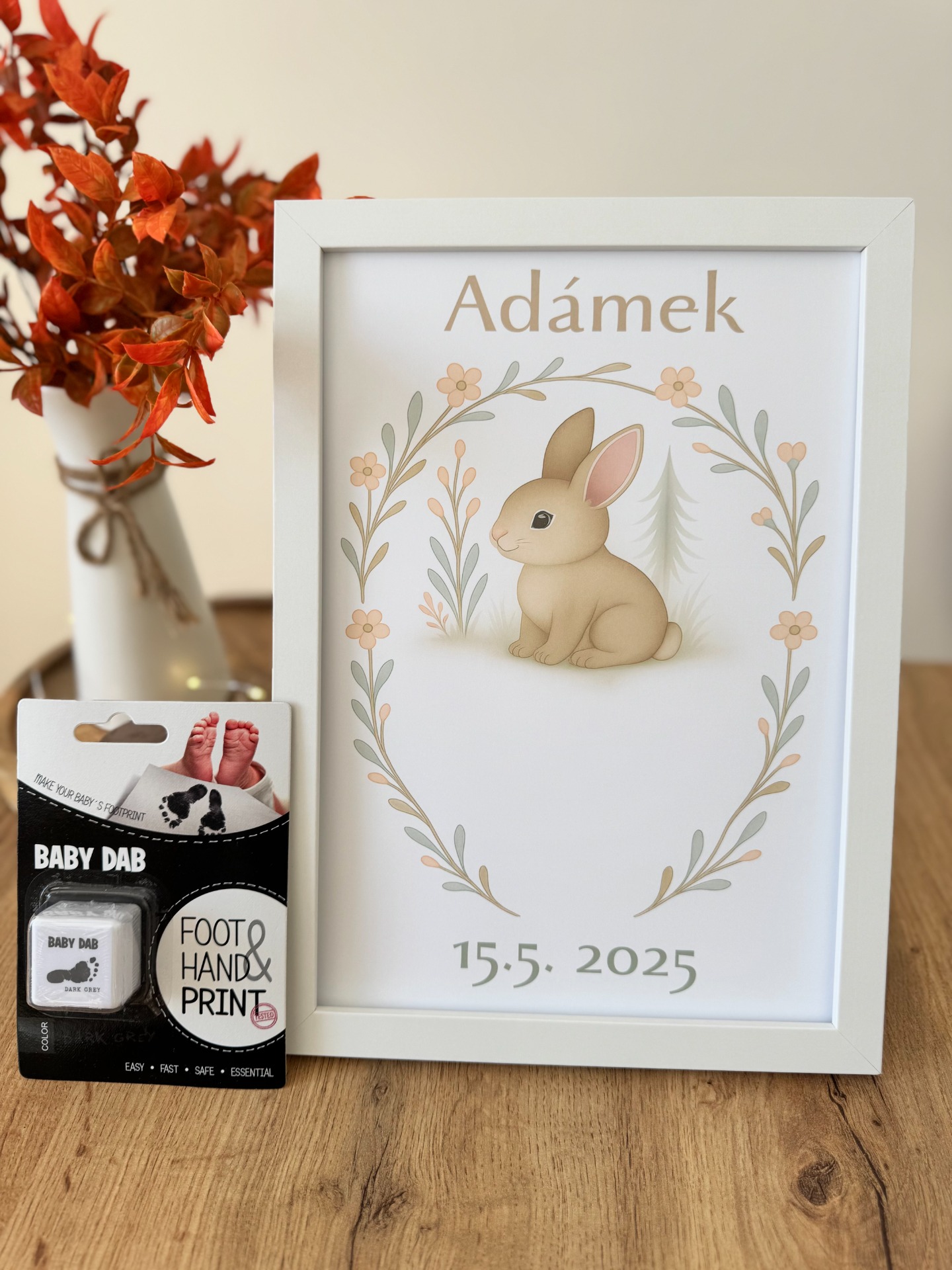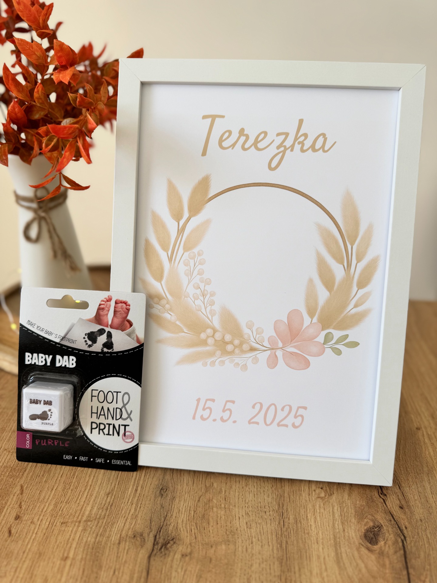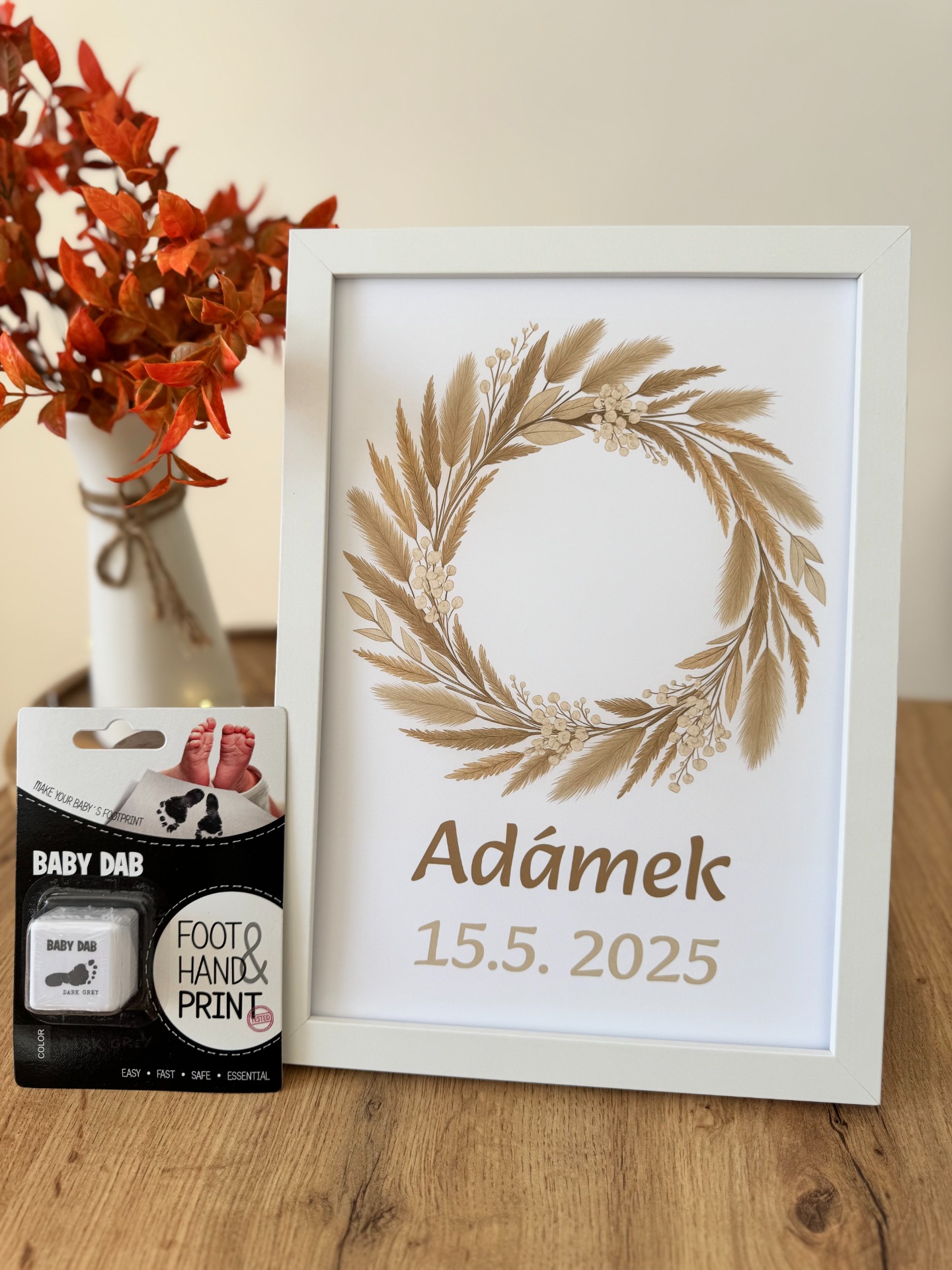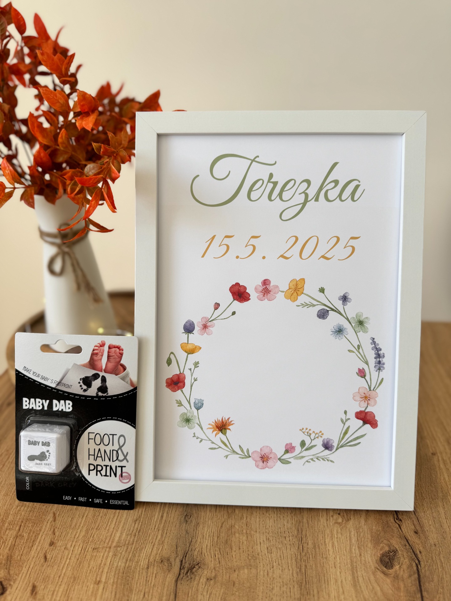 Obrázek je vytištěn na kvalitní matný papír 230g/m2, vhodný pro práci s inkoustem. V sadě naleznete 2x výtisk (kdyby se na poprvé nepodařilo) a také bezpečnou netoxickou barvu Baby dab, vhodnou pro novorozence. Lze zadat jen křestní jméno (“Adámek”, “Terezka”) a datum narození. Ve formátu A4 doporučujeme udělat jeden otisk ručičky nebo nožičky do volného prostoru, pokud si vyberete formát A3, krásně se vám vejdou obě ručičky/nožičky vedle sebe.