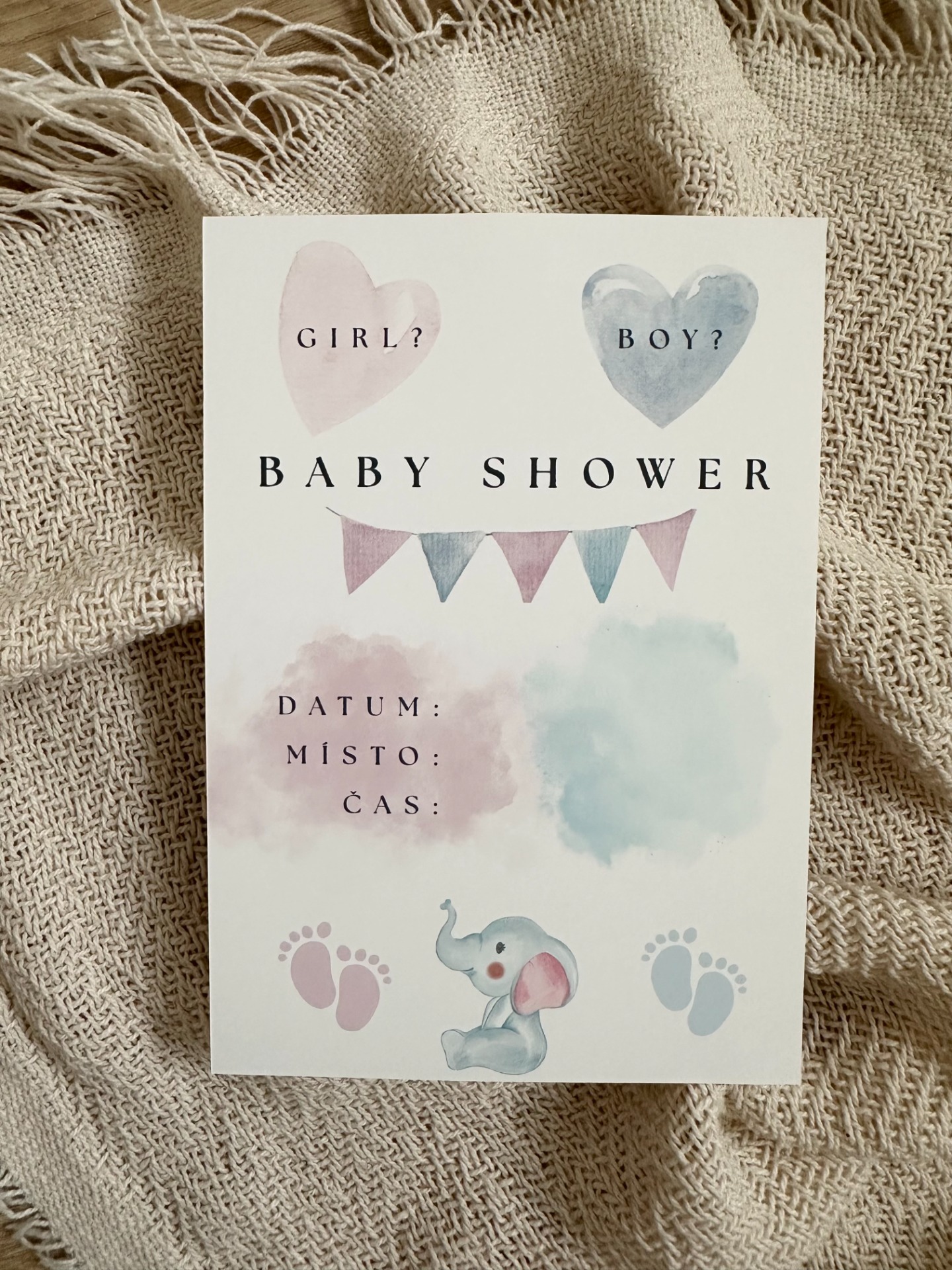 Roztomilé pozvánky na baby shower, připravené k ručnímu doplnění místa, data i času konání. Sada obsahuje 10 kartiček a 10 bílých obálek. Na obálku lze případně dopsat pro koho je určená. Krásný motiv se slůnětem.