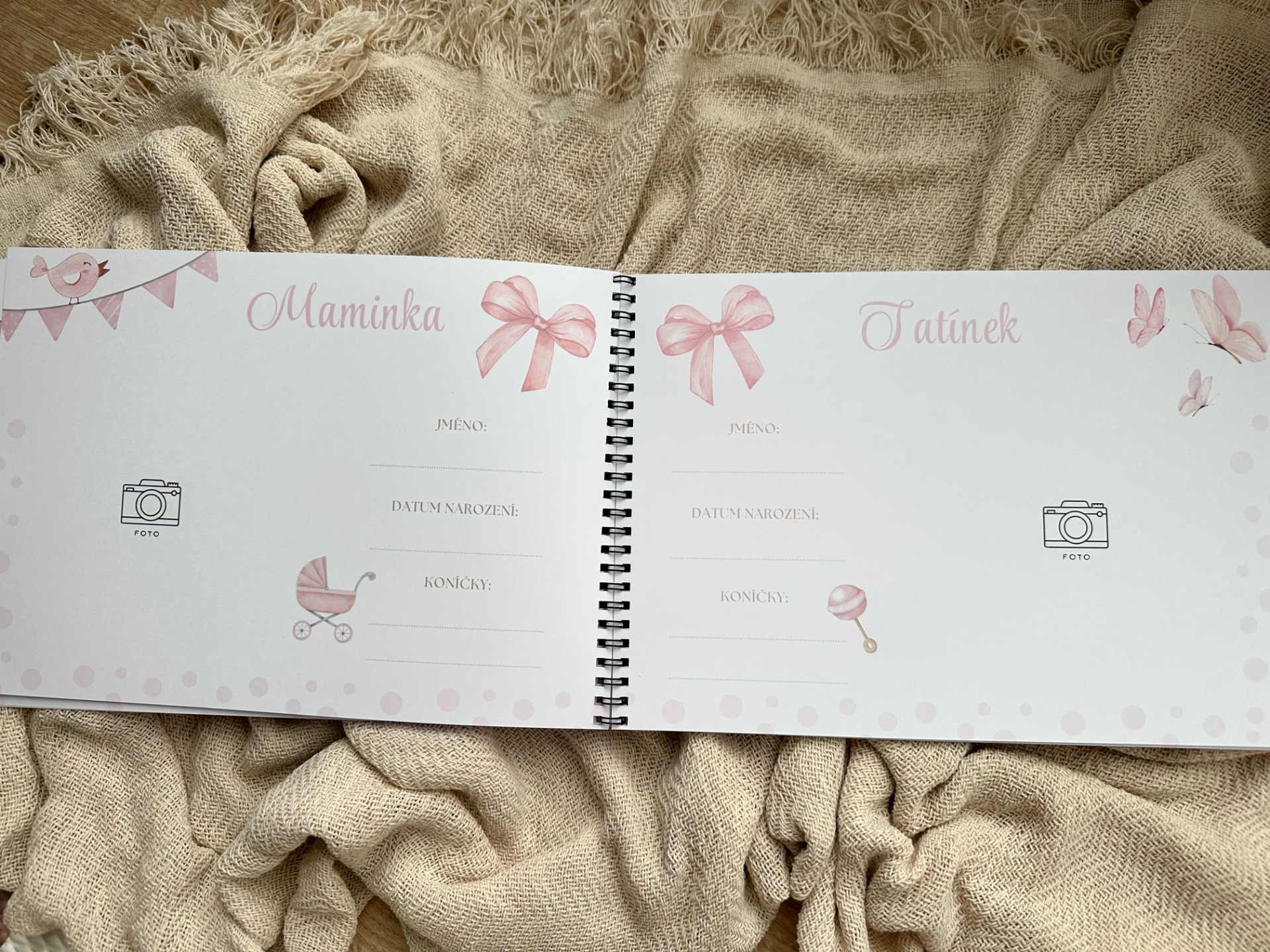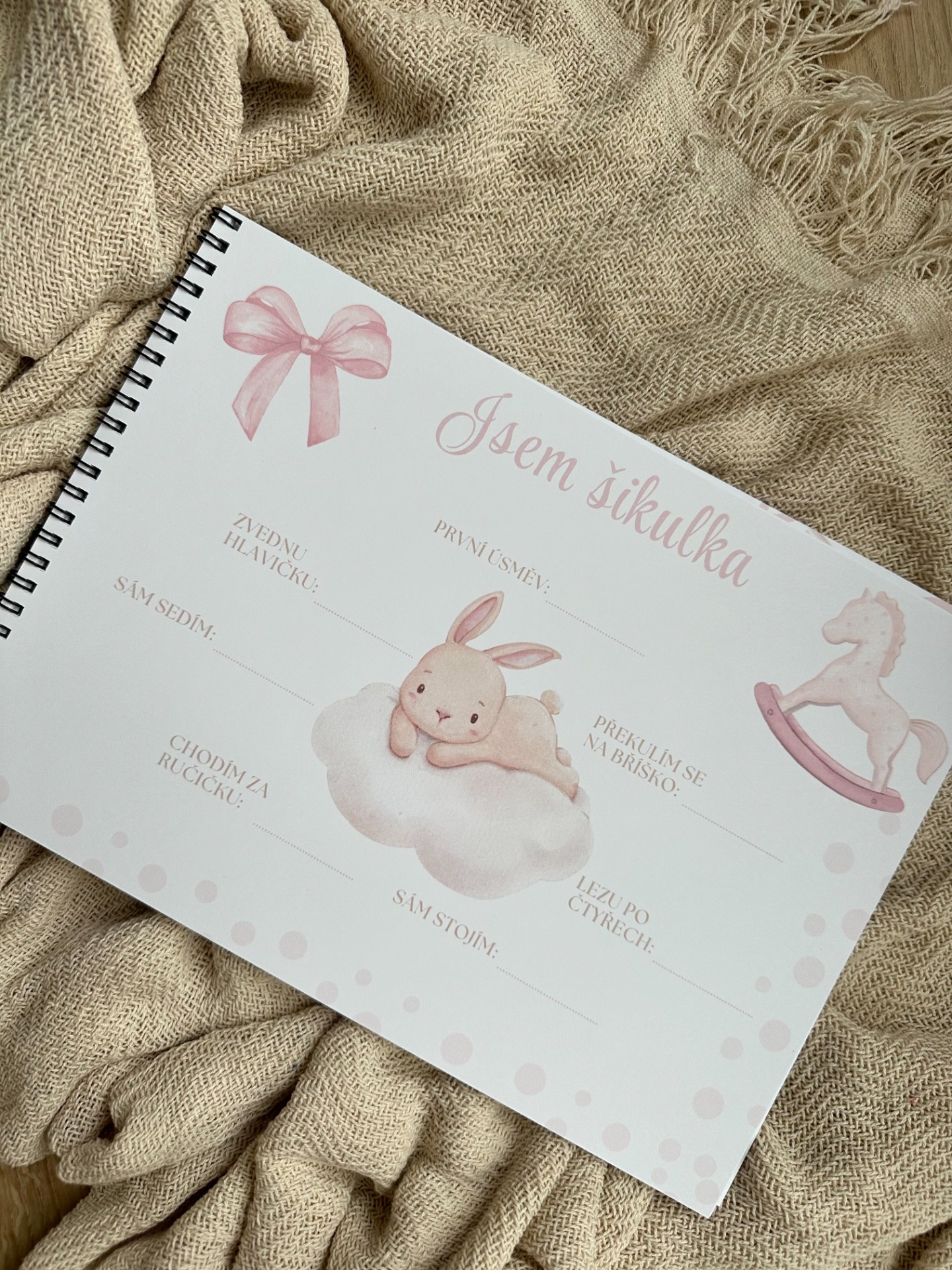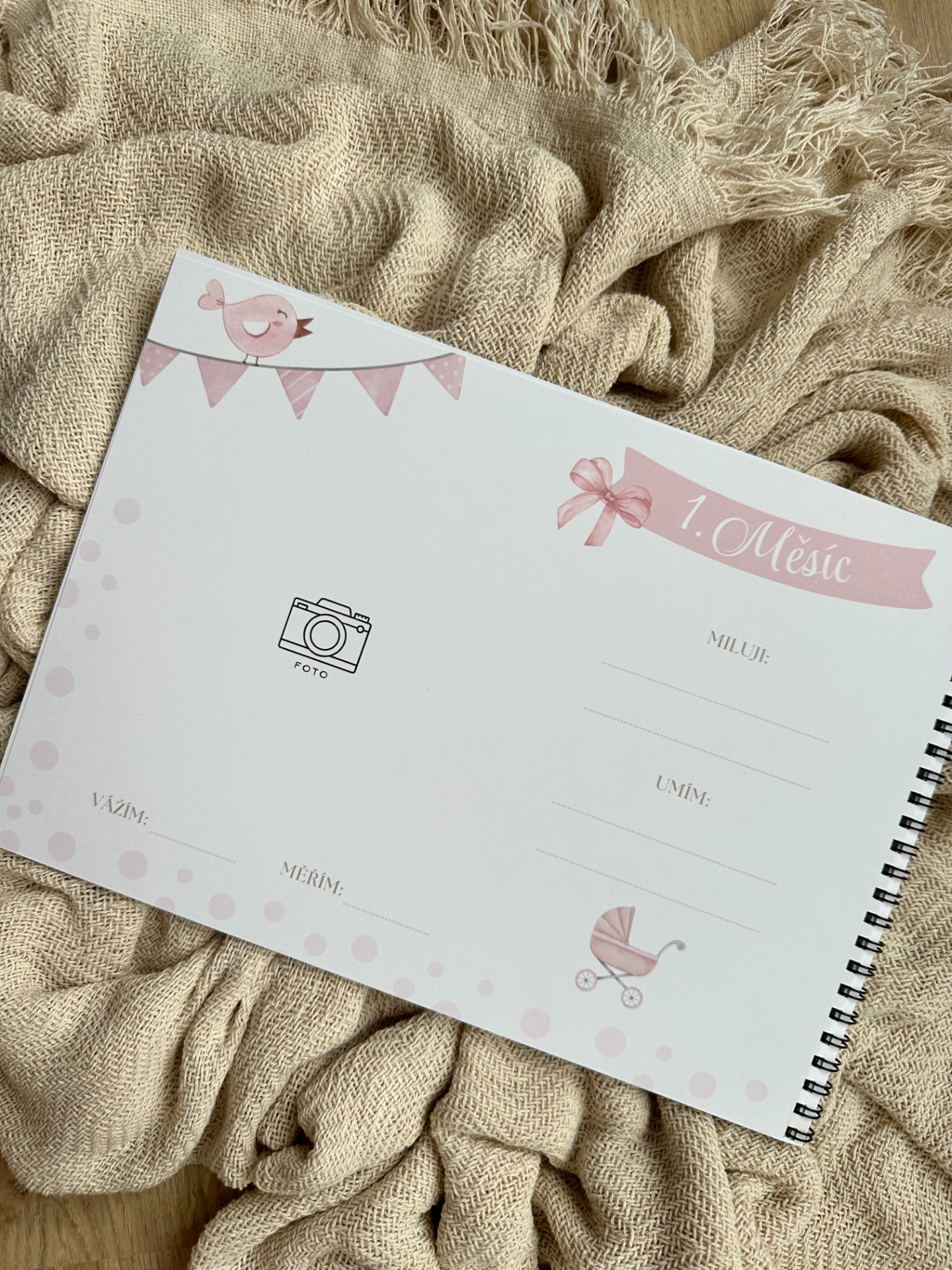 Zaznamenejte všechny důležité okamžiky z prvního roku vašeho miminka. Místo pro datumy, zápisky i prostor na vlepení fotografií. Holčičí motiv.
