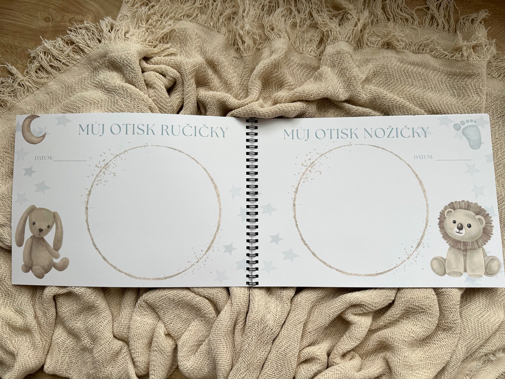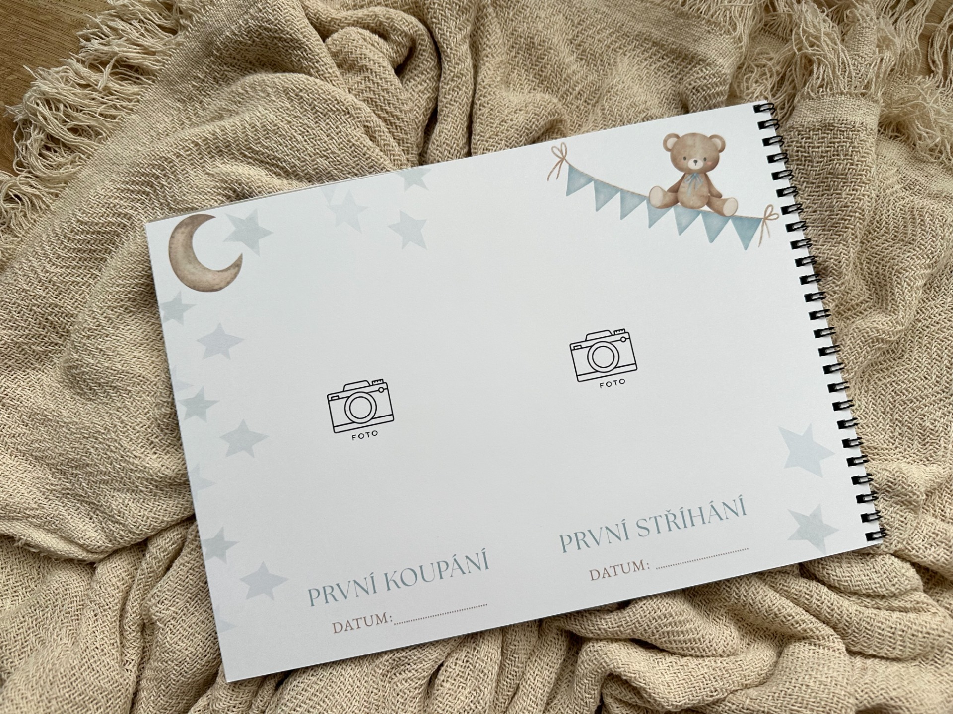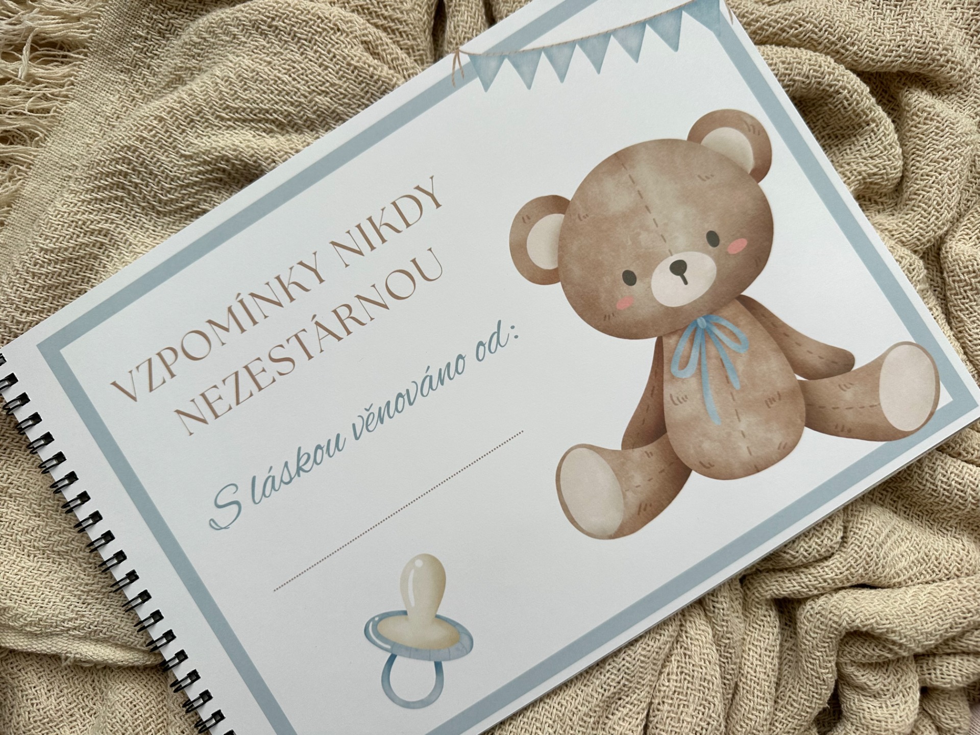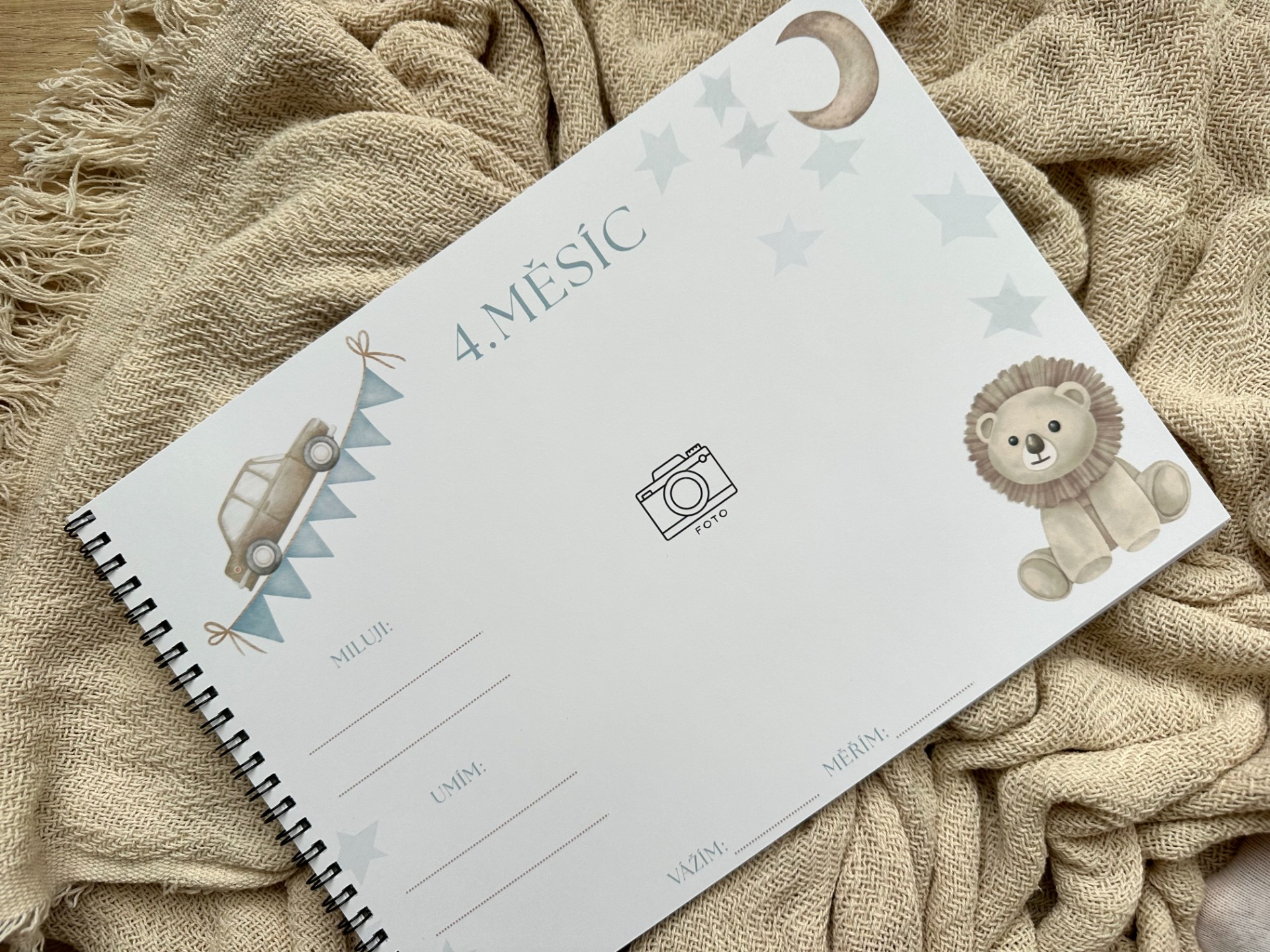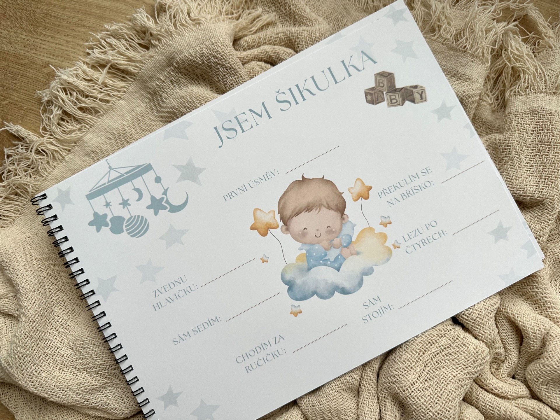 Zaznamenejte všechny důležité okamžiky z prvního roku vašeho miminka. Místo pro datumy, zápisky i prostor na vlepení fotografií. Klučičí motiv.