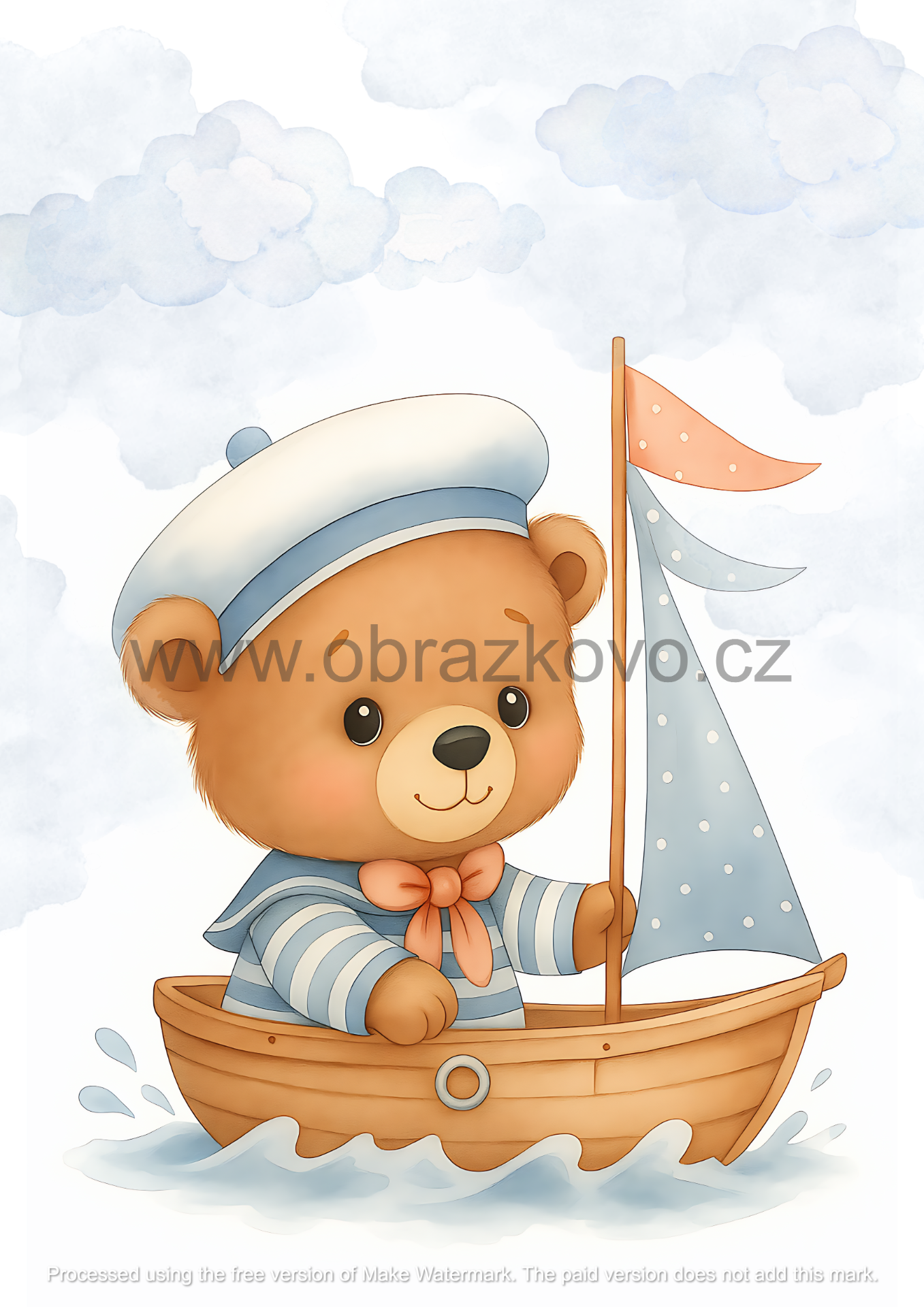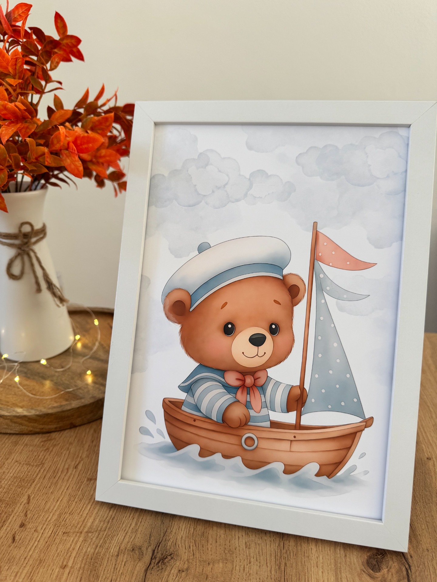 Roztomilý obrázek medvídka v lodičce v jemných přírodních tónech, ideální jako dekorace do dětského pokojíčku. Vytisknuto na kvalitní matný papír. Barevný motiv s jemným pozadím, který se hodí pro kluky i holčičky.