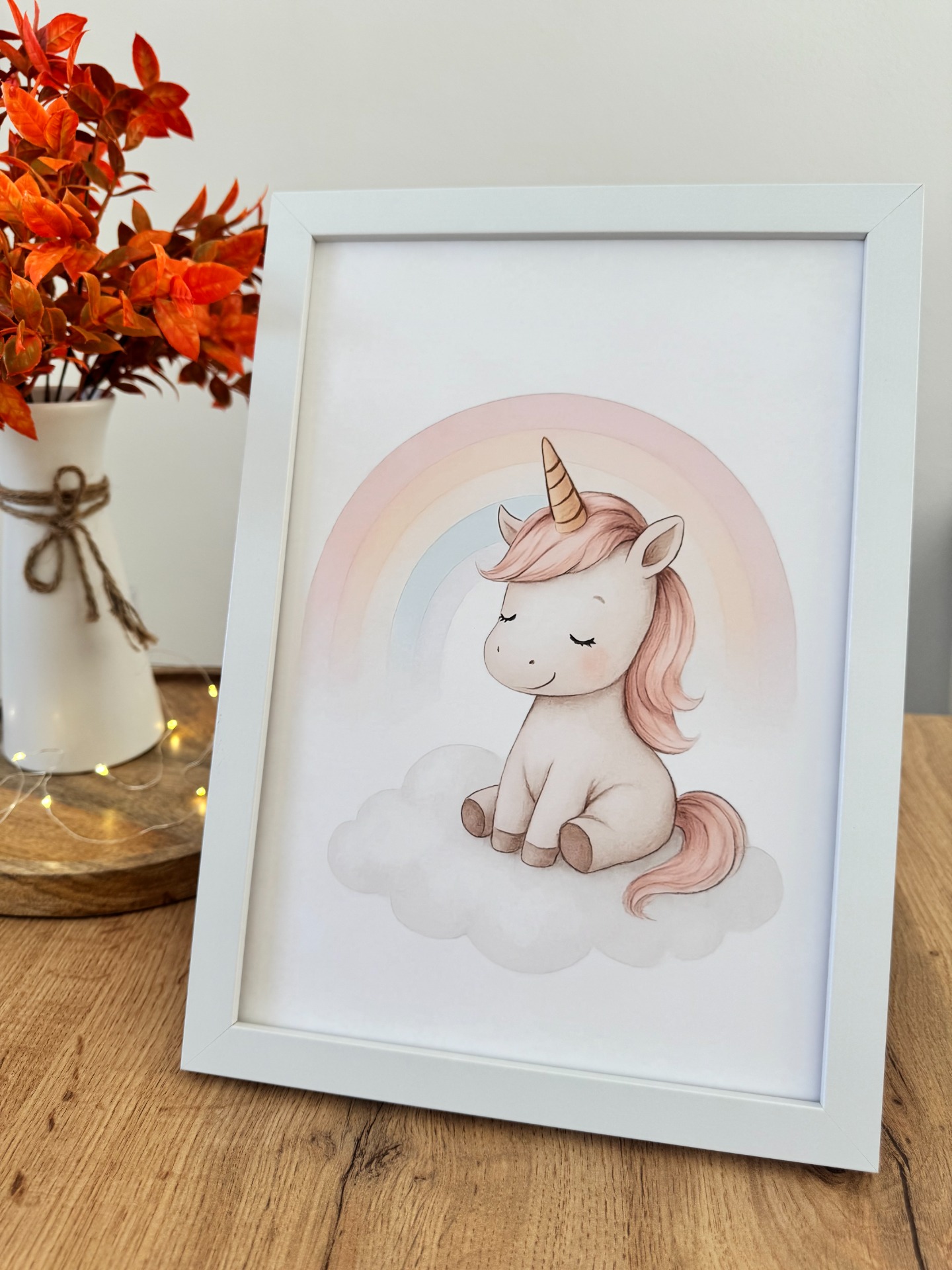 Roztomilý obrázek jednorožce v jemných přírodních tónech, ideální jako dekorace do dětského pokojíčku. Vytisknuto na kvalitní matný papír. Barevný motiv s jemným pozadím, který se hodí pro holčičky.