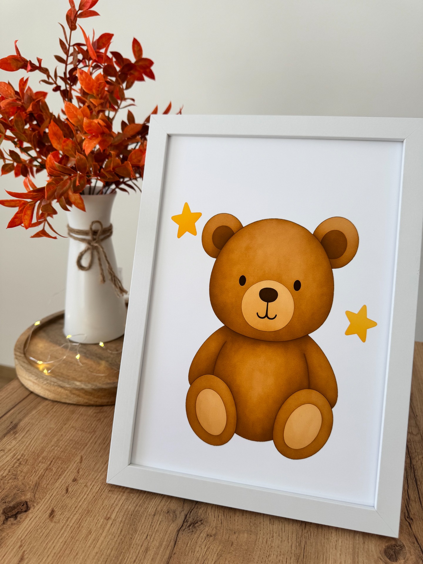Roztomilý obrázek medvídka s hvězdičkami v jemných přírodních tónech, ideální jako dekorace do dětského pokojíčku. Vytisknuto na kvalitní matný papír. Barevný motiv s jemným pozadím, který se hodí pro kluky i holčičky.