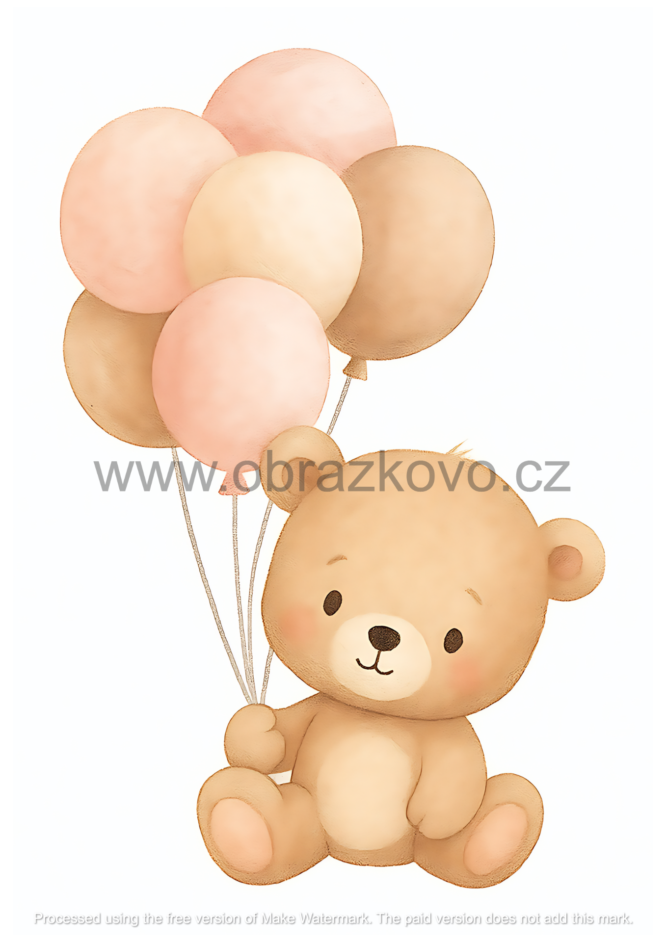 Roztomilý obrázek medvídka s balónky v jemných přírodních tónech, ideální jako dekorace do dětského pokojíčku. Vytisknuto na kvalitní matný papír. Barevný motiv s jemným pozadím, který se hodí pro holčičky.