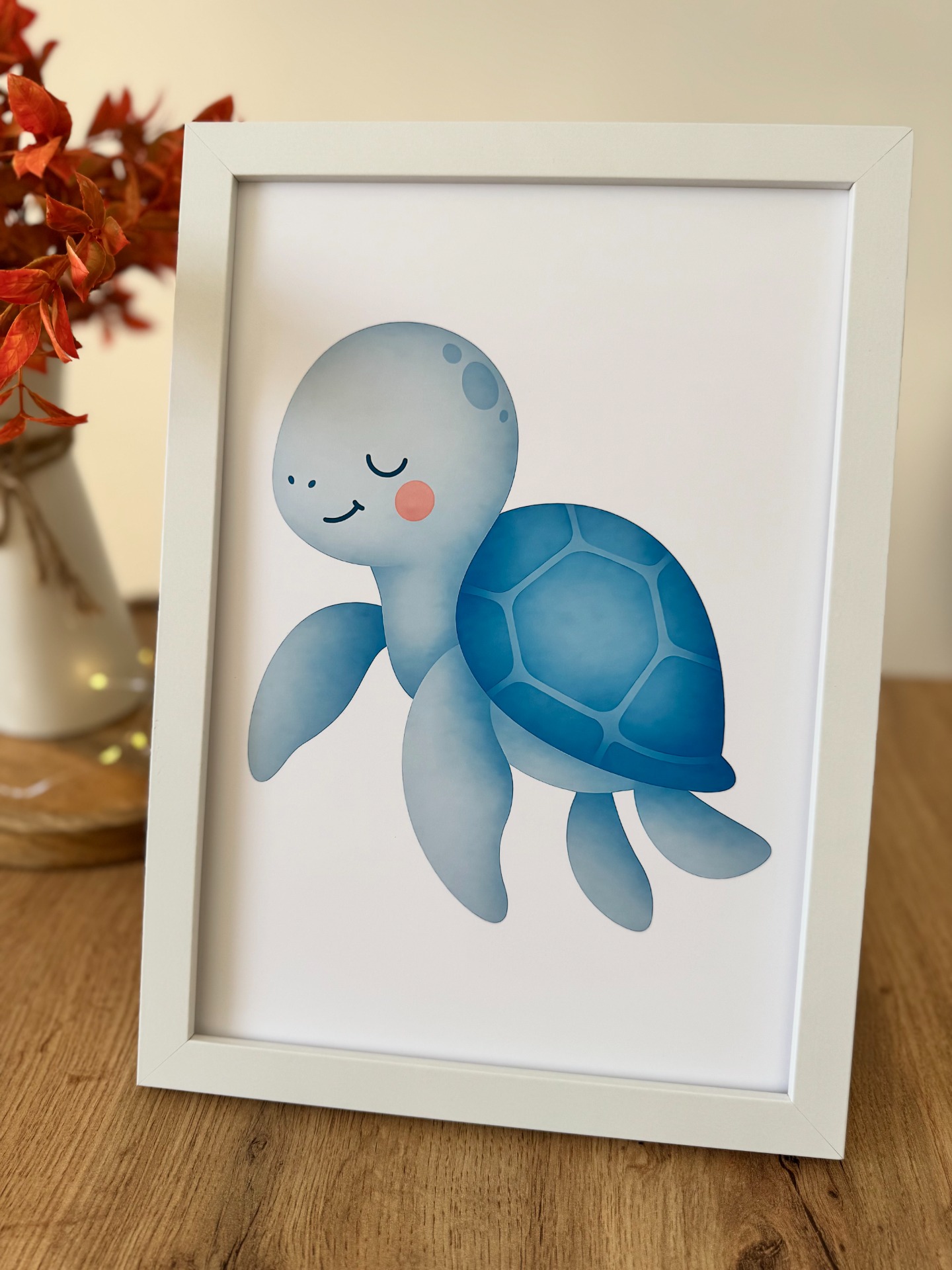 Roztomilý obrázek mořské želvy v jemných přírodních tónech, ideální jako dekorace do dětského pokojíčku. Vytisknuto na kvalitní matný papír. Barevný motiv s jemným pozadím, který se hodí pro kluky i holčičky.