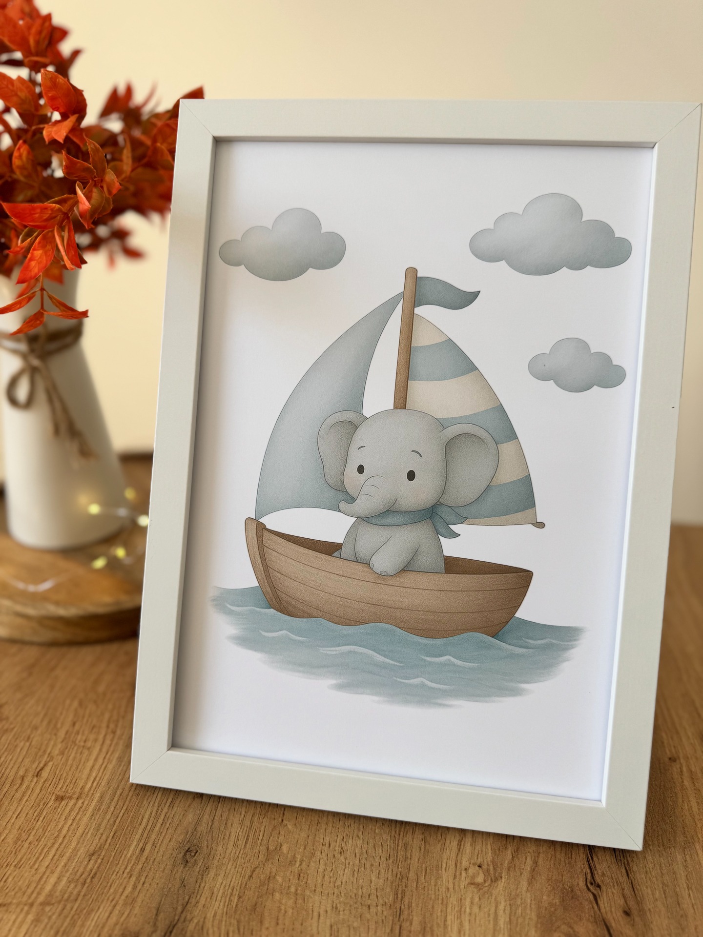 Roztomilý obrázek slona v lodičce v jemných přírodních tónech, ideální jako dekorace do dětského pokojíčku. Vytisknuto na kvalitní matný papír. Barevný motiv s jemným pozadím, který se hodí pro kluky i holčičky.