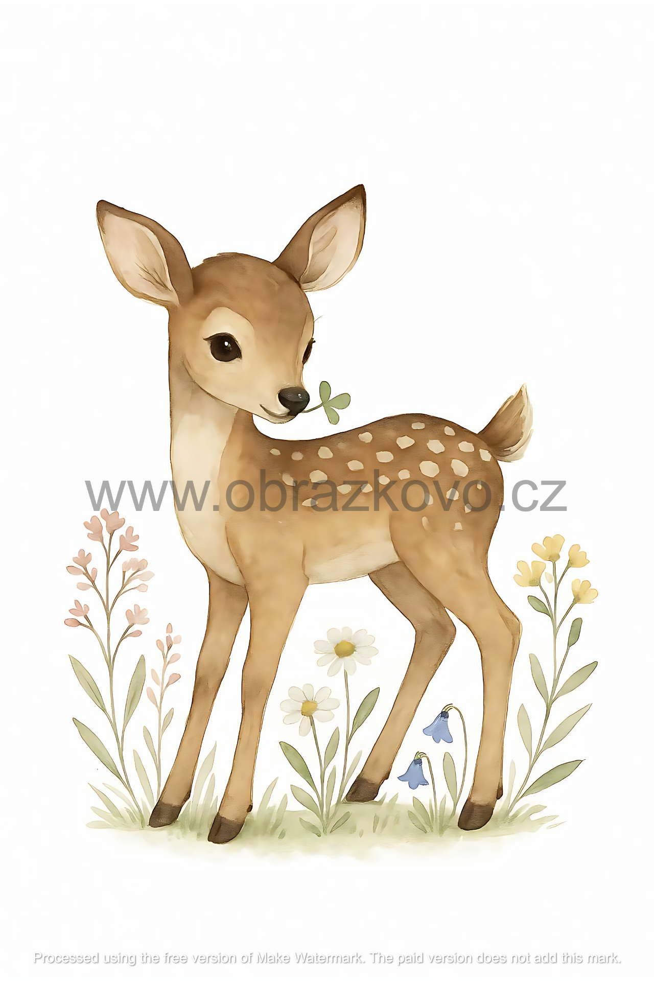 Roztomilý obrázek srnečka s kvítky v jemných přírodních tónech, ideální jako dekorace do dětského pokojíčku. Vytisknuto na kvalitní matný papír. Barevný motiv s jemným pozadím, který se hodí pro kluky i holčičky.