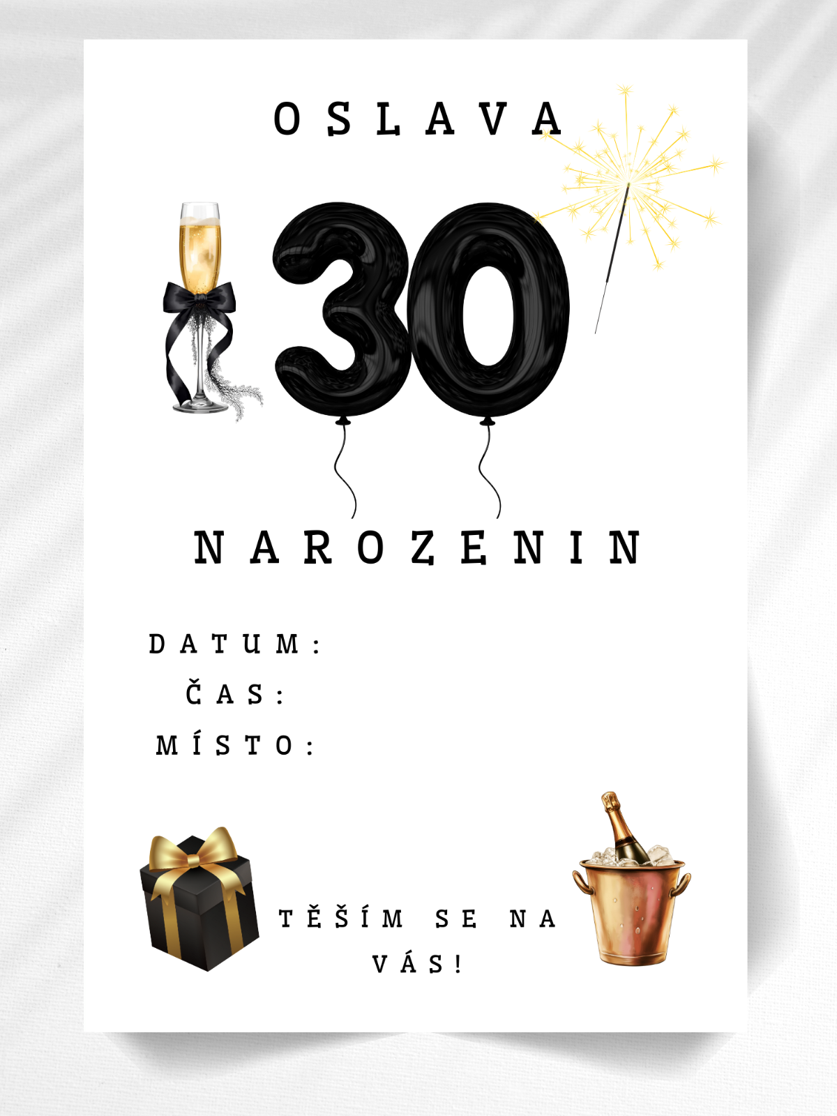 Roztomilé pozvánky na oslavu, připravené k ručnímu doplnění místa, data i času konání. Sada obsahuje 10 kartiček a 10 bílých obálek. Na obálku lze případně dopsat pro koho je určená. Krásný motiv pro 30.narozeniny.