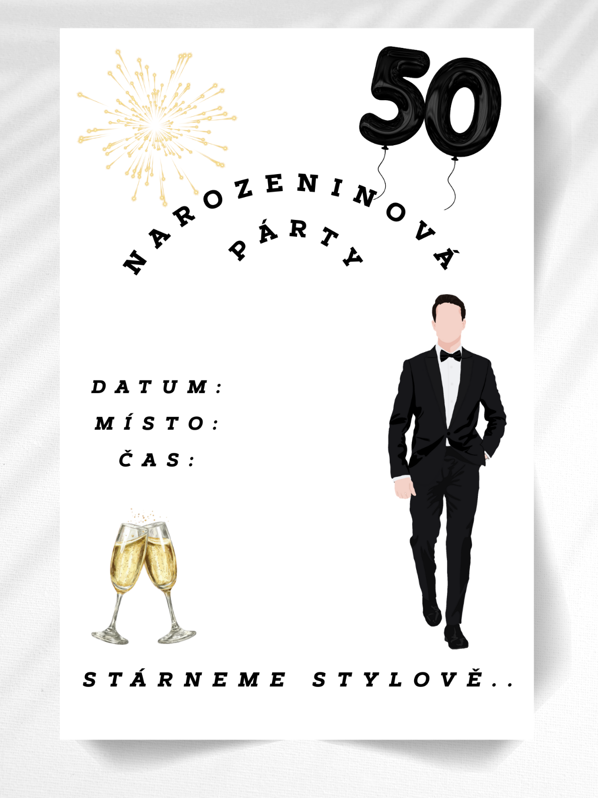 Roztomilé pozvánky na oslavu, připravené k ručnímu doplnění místa, data i času konání. Sada obsahuje 10 kartiček a 10 bílých obálek. Na obálku lze případně dopsat pro koho je určená. Krásný motiv pro 50.narozeniny.