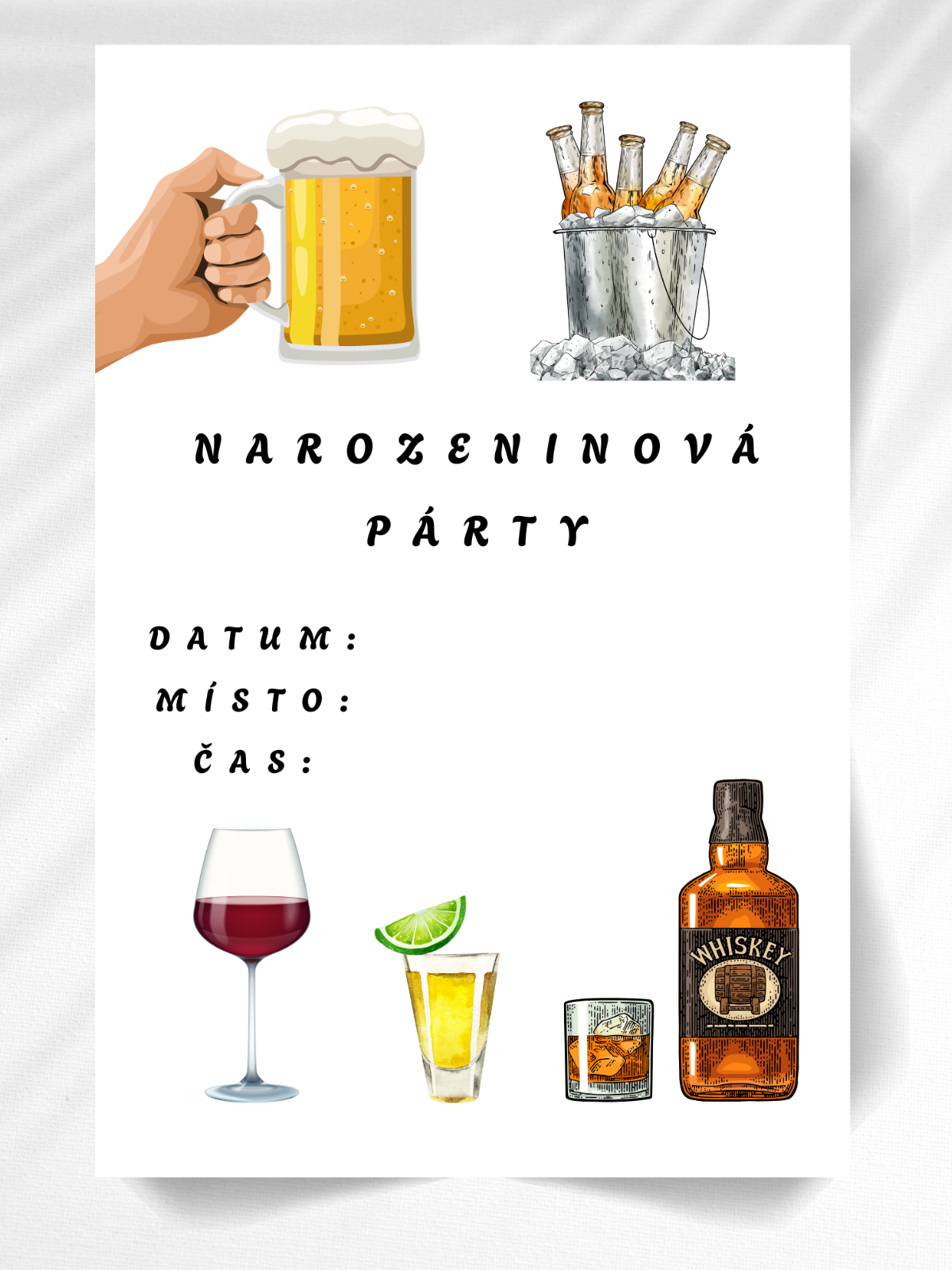 Roztomilé pozvánky na oslavu, připravené k ručnímu doplnění místa, data i času konání. Sada obsahuje 10 kartiček a 10 bílých obálek. Na obálku lze případně dopsat pro koho je určená. Krásný motiv s alkoholem.