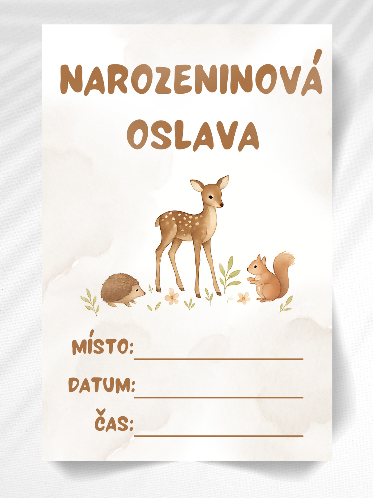 Roztomilé pozvánky na dětskou oslavu, připravené k ručnímu doplnění místa, data i času konání. Sada obsahuje 10 kartiček a 10 bílých obálek. Na obálku lze případně dopsat pro koho je určená. Motiv lesních zvířátek.