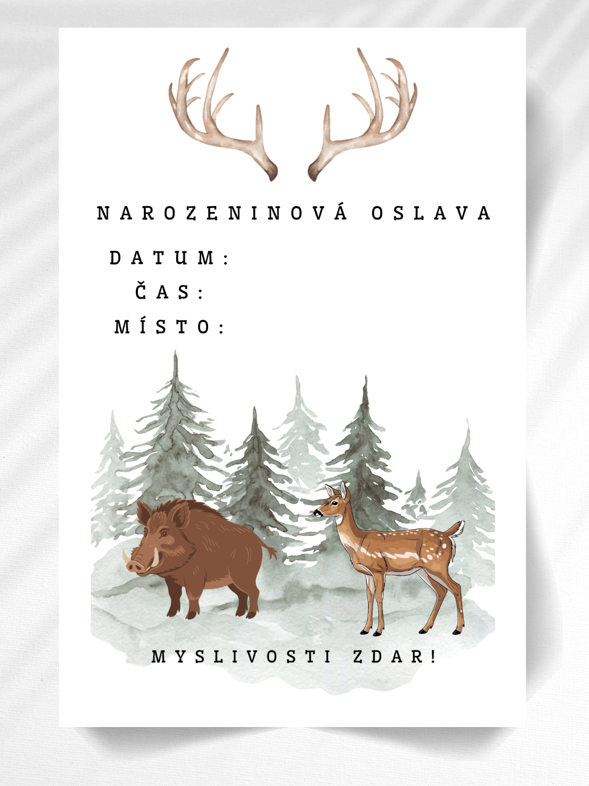 Roztomilé pozvánky na oslavu, připravené k ručnímu doplnění místa, data i času konání. Sada obsahuje 10 kartiček a 10 bílých obálek. Na obálku lze případně dopsat pro koho je určená. Krásný motiv pro myslivce.