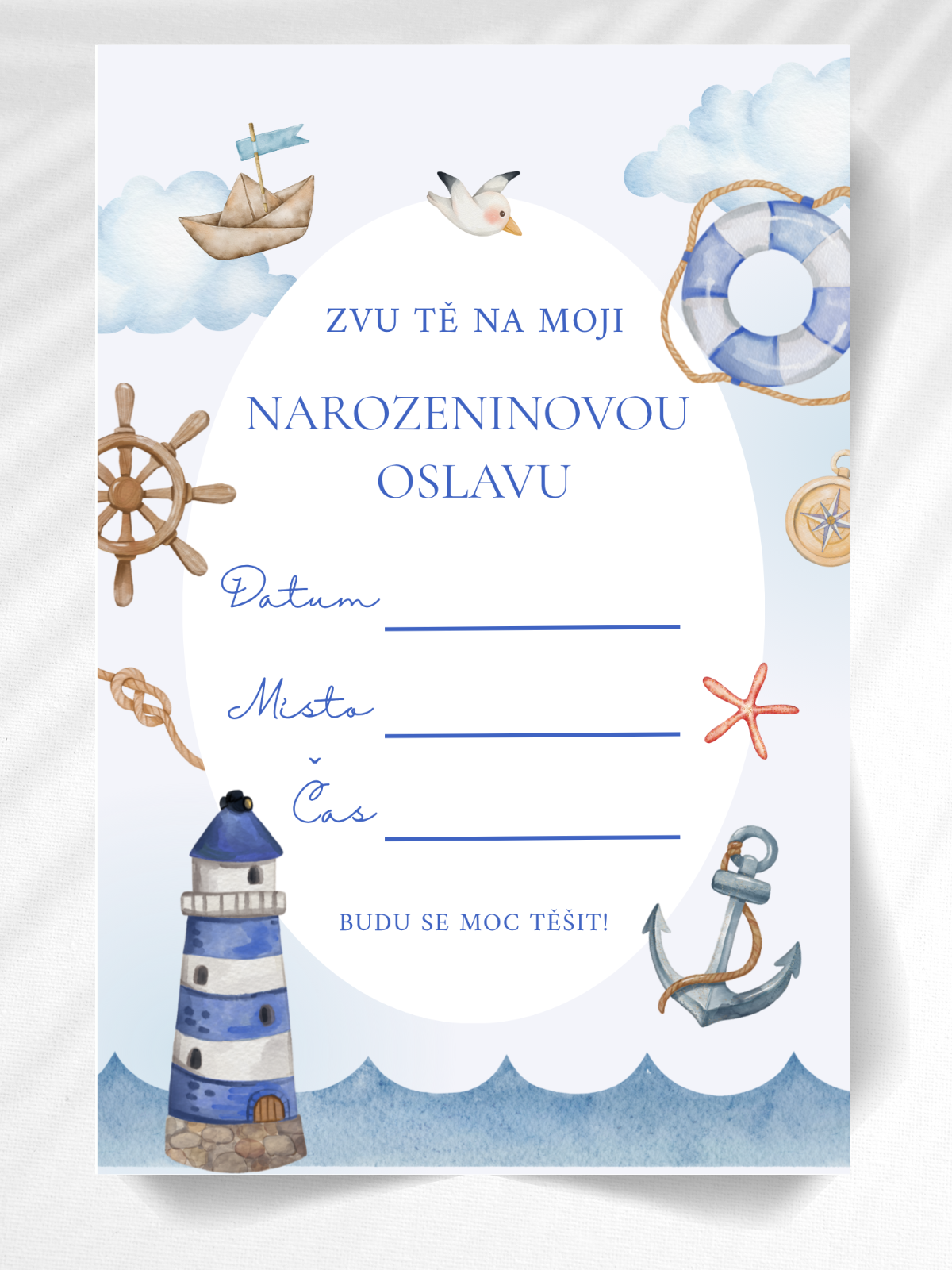 Roztomilé pozvánky na dětskou oslavu, připravené k ručnímu doplnění místa, data i času konání. Sada obsahuje 10 kartiček a 10 bílých obálek. Na obálku lze případně dopsat pro koho je určená. Námořnický motiv.