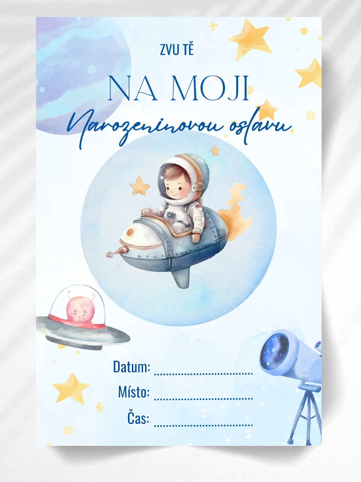 Roztomilé pozvánky na dětskou oslavu, připravené k ručnímu doplnění místa, data i času konání. Sada obsahuje 10 kartiček a 10 bílých obálek. Na obálku lze případně dopsat pro koho je určená. Motiv kosmonauta ve vesmíru.