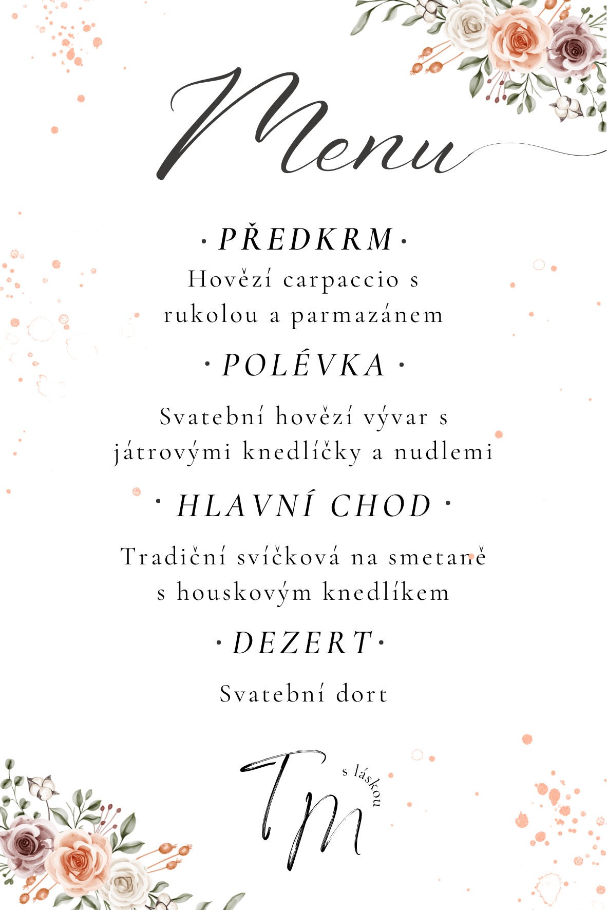 Svatební menu - formát 10x15cm, kvalitní matný papír 260g/m2, vhodné k položení na stůl