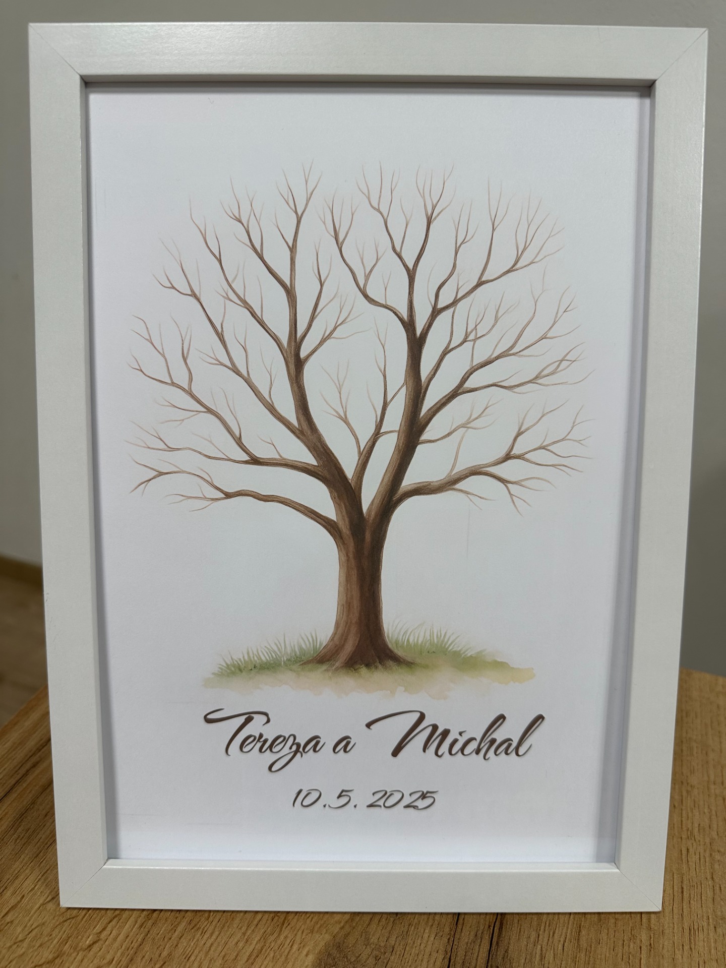 Svatební strom - varianta A včetně bílého rámu a inkoustového polštářku pro otisky prstů a dopsání jmen svatebních hostů. Barva inkoustového polštářku dle vašeho výběru. Tisk na kvalitní matný papír vysoké gramáže.