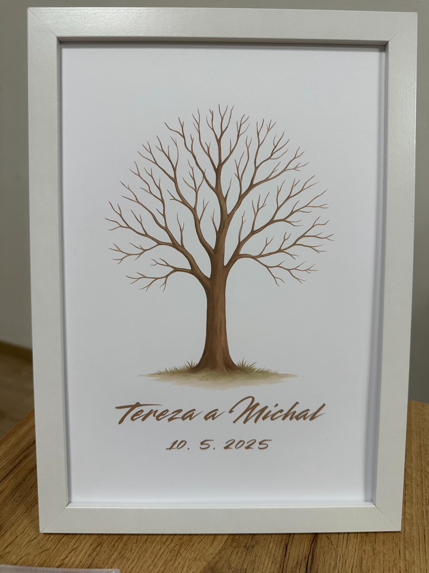 Svatební strom - varianta B včetně bílého rámu a inkoustového polštářku pro otisky prstů a dopsání jmen svatebních hostů. Barva inkoustového polštářku dle vašeho výběru. Tisk na kvalitní matný papír vysoké gramáže.