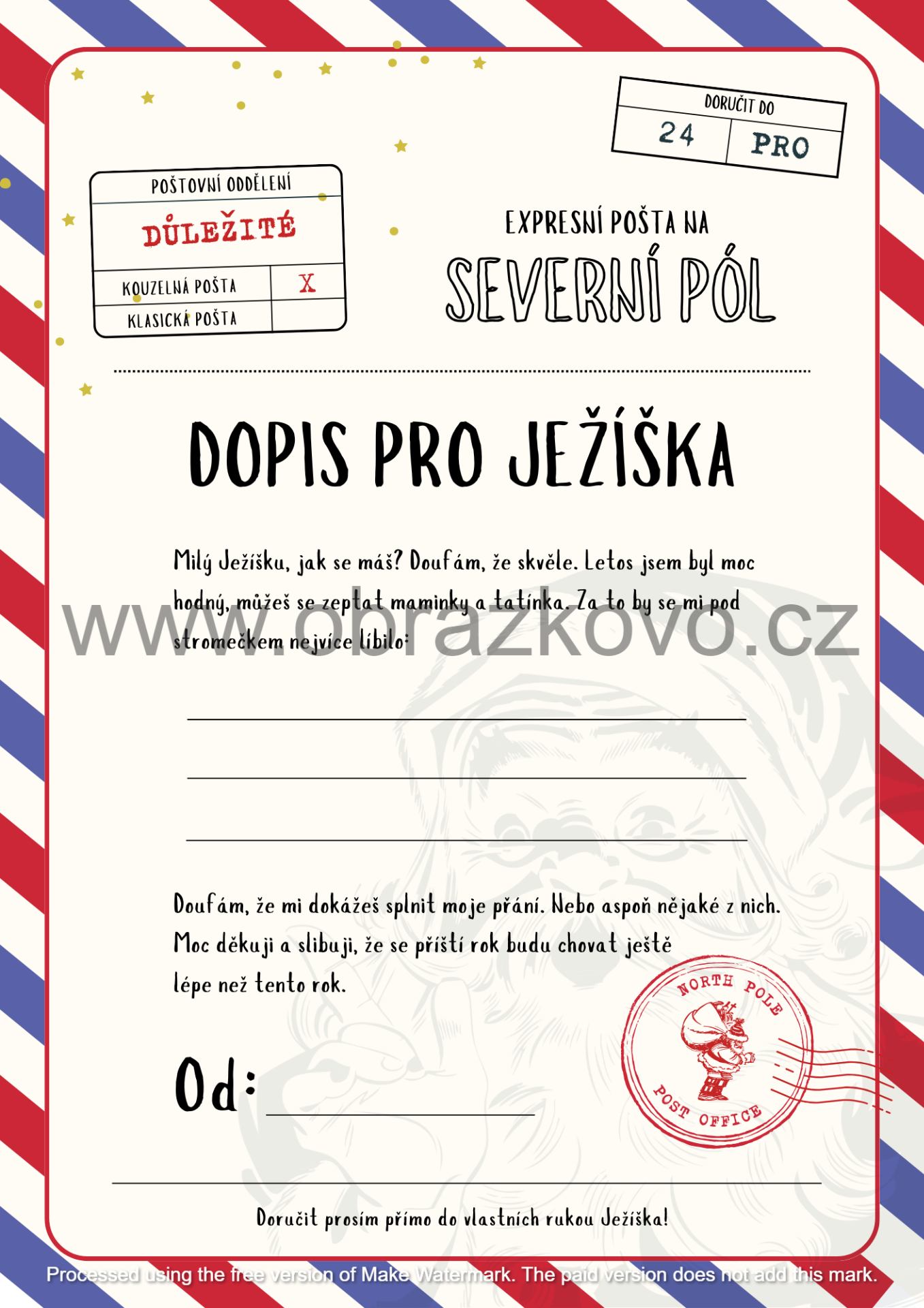 Dítě si může dopis vyplnit samo nebo společně s rodiči. Může napsat co si přeje pod stromeček a jak se mu dařilo celý rok a připojit obrázky nebo namalovat na druhou stranu dopisu, která je volná. Obálka s vánoční známkou a nápisem "Pro Ježíška od..."udělá ten pocit opravdového dopisu ještě reálnější.